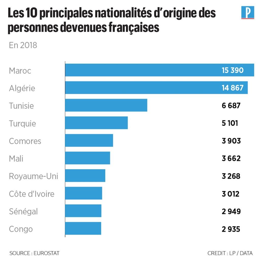 Prema podacima Eurostata za 2018. godinu, Severnoafrikanci su daleko najdraži državljani, počev od Marokanaca, zatim Alžiraca i Tunižana. Slede Turci i ljudi iz nekoliko zemalja podsaharske Afrike, poput Malija, Senegala, Kameruna ili Komora, blizu Majote. Najbrojniji Evropljani koji su dobili francusko državljanstvo dolaze iz Ujedinjenog Kraljevstva, u pozadini Bregzita.