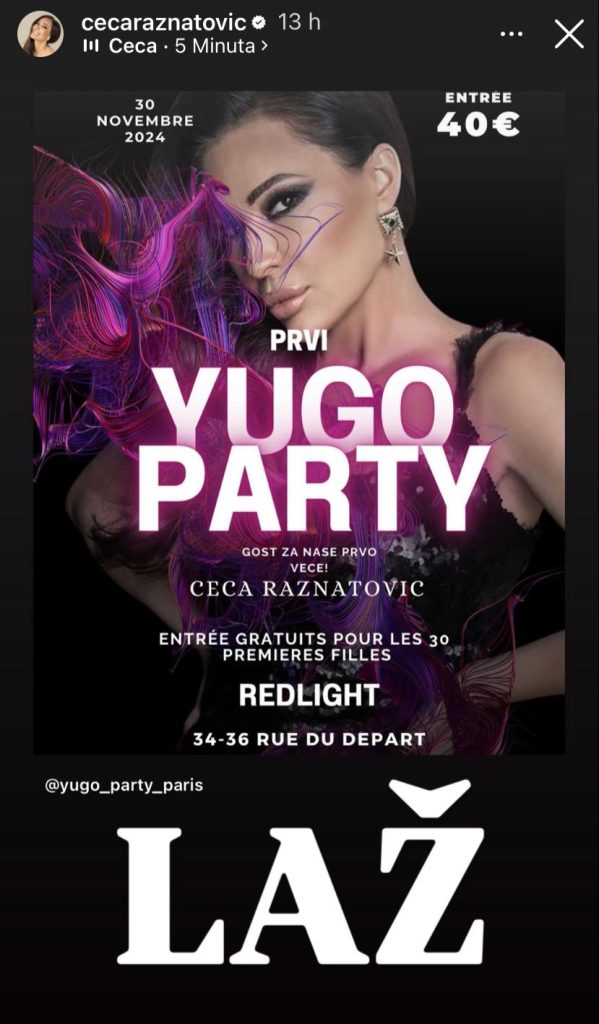 Na društvenim mrežama nedavno se pojavila objava o navodnom nastupu popularne pevačice Cece Ražnatović u Parizu. Na Instagram profilu @yugo_party_paris, najavljen je događaj pod nazivom „Prvi Yugo Party“, zakazan za 30. novembar 2024. godine u klubu „Redlight“. Na plakatu za ovaj događaj, prikazana je Cecina fotografija, uz informacije da će ona biti „gost večeri“ uz cenu ulaznica od 40 evra i druge detalje o događaju.
