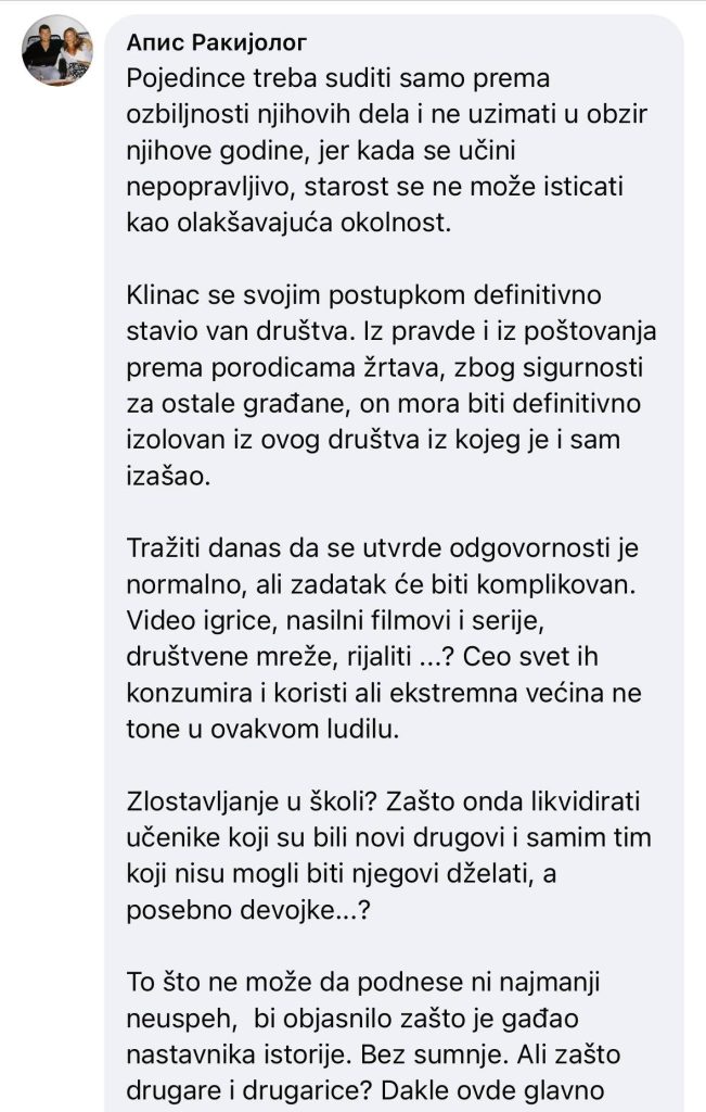 Na kraju je klinac dao rešenje : „Ja sam psihopata“. Sada ostaje da se vidi zašto je i postao. Tako da se video igrice, nasilje na ekranima i društvenim mrežama pojavljuju ne kao uzrok i pokretački faktor kao što svi žele da ih nametnu , već kao put za ispoljavanje nečije psihopatije.