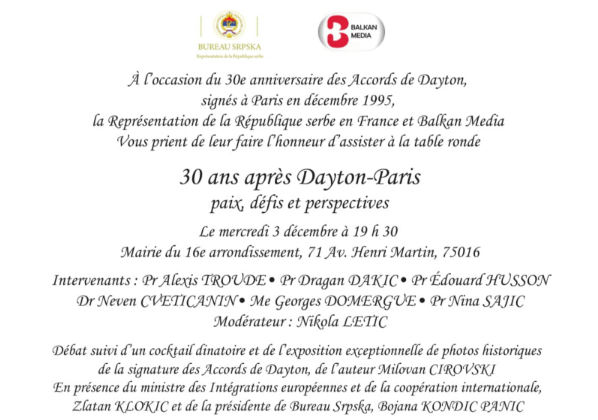 U Gradskoj kući 16. arondismana biće održan okrugli sto „30 godina posle Dejtona: Mir, izazovi i perspektive“, povodom tri decenije od potpisivanja Dejtonsko-pariskog sporazuma. Događaj počinje u 19.30 časova, a organizuju ga Predstavništvo Republike Srpske u Francuskoj i Balkan Media.