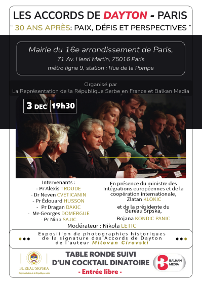U Gradskoj kući 16. arondismana biće održan okrugli sto „30 godina posle Dejtona: Mir, izazovi i perspektive“, povodom tri decenije od potpisivanja Dejtonsko-pariskog sporazuma. Događaj počinje u 19.30 časova, a organizuju ga Predstavništvo Republike Srpske u Francuskoj i Balkan Media.