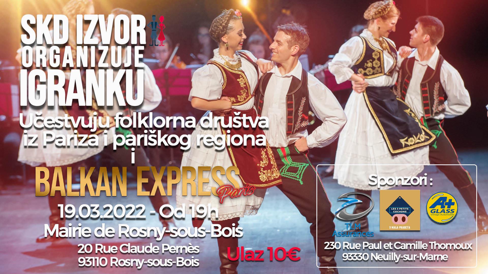 Igranka obećava dobar provod i program nekoliko folklornih društava iz Pariza i pariskog regiona. Ovi razigrani ljudi očekuju vas 19. marta od 19 časova u Mairie de Rosny. Cena karte je 10 evra.
