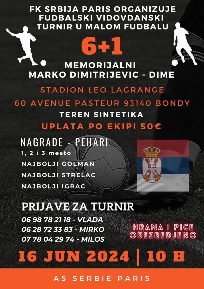 FK Srbija Pariz sa ponosom najavljuje fudbalski Vidovdanski turnir u malom fudbalu, koji će se održati 16. juna 2024. godine s početkom u 10 sati. Ovaj memorijalni turnir organizuje se u čast tragično nastradalog dugogodišnjeg fudbalera pariske „Srbije“, Marka Dimitrijevića Dimeta. Turnir će se održati na stadionu Léo Lagrange, na adresi Avenue Pasteur 93140 Bondy, na terenu sa sintetičkom podlogom.
