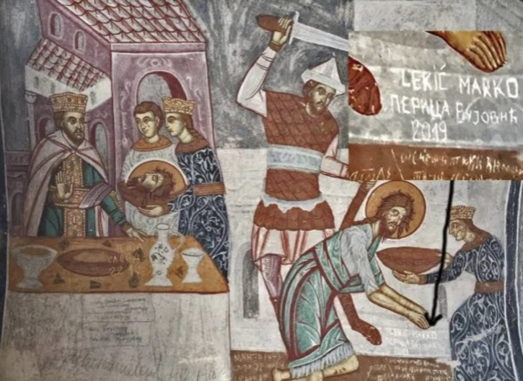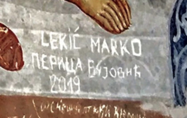 (FOTO) SKANDAL. Urezali svoja imena na fresku u Hilandaru