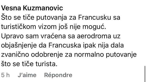 Jedna od vraćanih putnica sa aerodroma, Vesna Kuzmanović, napisala je u našoj grupi na Facebook-u da je vraćena sa aerodroma uz obrazloženje da nema još uvek zvaničnog dopisa.