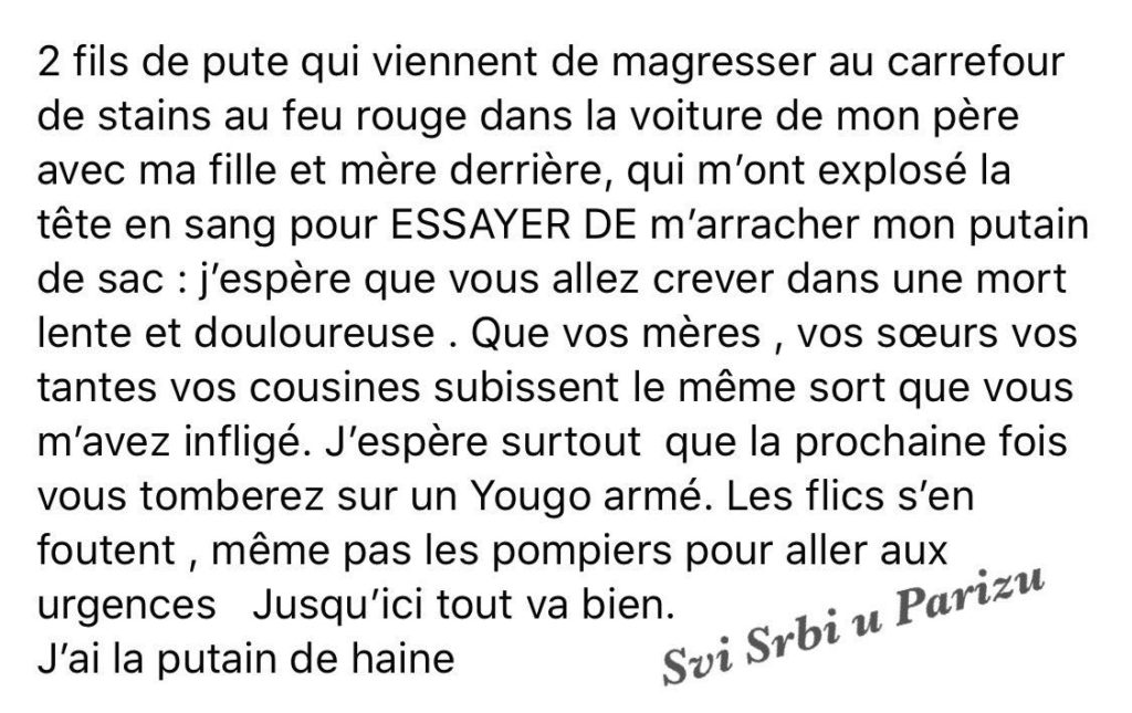 Veoma besna je napisala da želi da napadači „crkavaju sporo i bolno“ da njihove majke, sestre, tetke, rođake „prođu kroz ono što je ona“. Ali se najviše nada da će napadači sledeći put pasti na jednog naoružanog „Jugoslovena“.