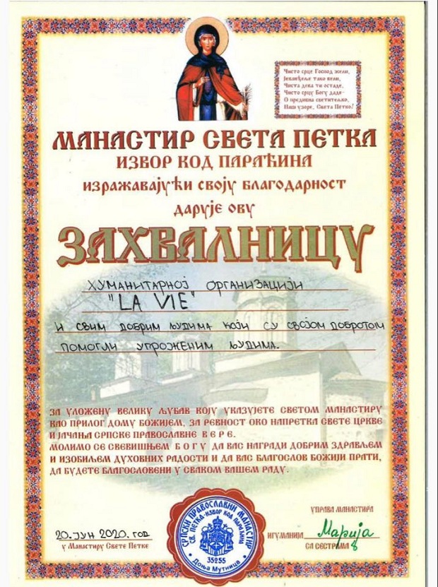 Pre nekoliko meseci humanitarna organizacija iz Pariza „La Vie“ uz medijsku podršku „Svi Srbi u Parizu“ pokrenula je akciju prikupljanja pomoći manastiru Sveta Petka Izvorska kod Paraćina o čemu smo vas već obaveštavali. Ovaj manastir je po nečemu specifičan i zato je izabran da se pomogne.