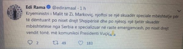 Od prvih zemalja koje su poslale pomoć je Srbija. Specijalci su već krenuli put Albanije a predsednik Albanije Edi Rama se na tviteru javno zahvalio :