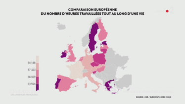 Emanuel Makron: „Postoji jedna stvar gde smo daleko ispod svih suseda, to je to. Ovo su sati odrađeni tokom celog života. Što je tamnije, više se radi. Što je svetlije, manje se radi. Ako želimo da uspemo, ako želimo da idemo napred, ne preostaje nam ništa drugo nego da radimo više. Od leta 2023. godine, kao što sam vam rekao 14. jula, od leta 2023. moraćemo da pomerimo starosnu granicu odlaska za četiri meseca godišnje. To znači da tamo gde smo danas sa 62 godine, preći ćemo 2025. na 63 godine, u 2028. na 64 godine i u 2031. na 65 godina. Tako postepeno. Postoji samo jedan način da uradimo ako smo lucidni, pošto živimo duže, a to je da radimo duže.“