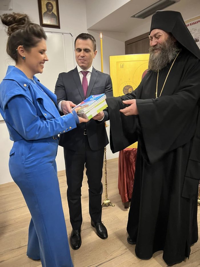 Ministar Milićević je direktorki škole Antonini Miljković uručio donaciju – lektire i bukvare za sve učenike. On je, ukazavši na to da je važno sačuvati naš identitet i jezik, rekao da je otvaranje ove škole, u organizaciji Generalnog konzulata Srbije u Solunu i manastira Hilandar, značajan korak u tom smeru.