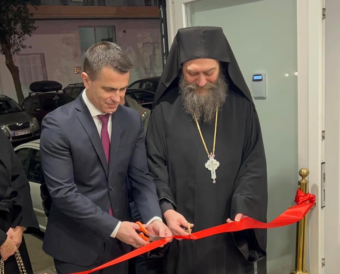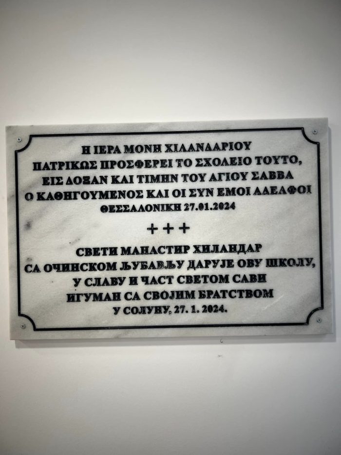 Vrpcu su zajedno presekli iguman Metodije i ministar Milićević. Otkrivena je tabla na kojoj piše – Sveti Manastir Hilandar sa očinskom ljubavlju daruje ovu školu u slavu i čast Svetom Savi. Iguman sa svojim bratstvom u Solunu 27. 1. 2024.