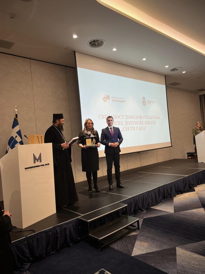 Svečanost povodom otvaranja škole u novim prostorijama i proslave Savindana kojaje organizovana pod pokroviteljstvom Manastira Hilandara, Republike Srbije i Republike Grčke nastavljena je u hotelu „Makedonija Palas”.