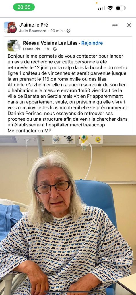 „Dana 12. juna, starija žena je pronađena dezorijentisana u metrou na liniji 1 (Château de Vincennes), od strane RATP službe. Veruje se da je do tamo stigla koristeći autobus 115 iz pravca Romanville ili Les Lilas. Otežavajuća okolnost je što baka boluje od Alchajmerove bolesti i ne seća se mesta stanovanja. Njen fizički opis: visoka je oko 1,5 metara. Prema našim saznanjima, baka dolazi iz Banata u Srbiji, ali živi u Francuskoj i očigledno je sama u stanu. Pretpostavljamo da živi u blizini Romanville, Les Lilas ili Montreuil, i da se zove Darinka Perinac“, napisala je Diana Ris u apelu u grupi Réseau Voisins Les Lilas.