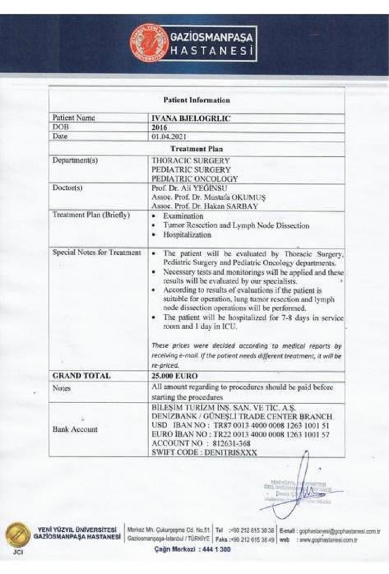 Onda su njeni roditelji tražili pomoć u celom svetu i kucali (elektronskom poštom) na vrata najboljih bolnica. Jedna prestižna turska bolnica je jedina odlučila da pokuša da spasi život male Ivane i dala tako tračak nade njenim roditeljima. Dobri ljudi su se organizovali i platili avion i Ivana se trenutno nalazi u Turskoj. Operacija je zakazana za sredu 14.aprila i samo je za operaciju potrebno 25000€. Posle toga će verovatno još novca biti potrebno jer se nadamo da će uz pomoć Boga operacija usoeti i svakako ćemo vas obaveštavati na vreme o svemu.