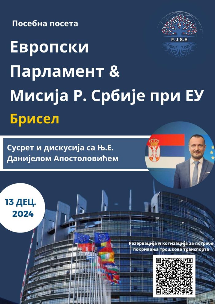Organizacija „Federacija mladih Srba Evrope (FJSE)“ organizuje svoju premijernu posetu Evropskom parlamentu i Misiji Republike Srbije pri Evropskoj uniji u Briselu. Ova jedinstvena poseta zakazana je za 13. decembar 2024. godine i pruža priliku mladima da učestvuju u susretu i razmeni mišljenja sa Njegovom Ekselencijom Danijelom Apostolovićem.