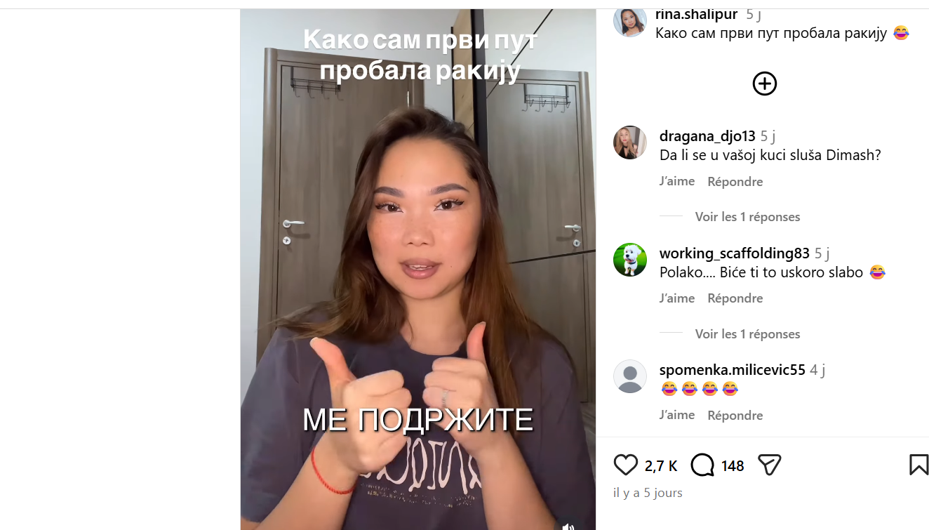 Kazahstanka Rina Shalipur koja se zbog ljubavi preselila u Srbiju i udala za Srbina postala je hit na društvenim mrežama nakon što je podelila svoje iskustvo prvog susreta sa rakijom. Kako je ispričala u videu, nije ni slutila kakvu će reakciju imati ovo tradicionalno piće, koje ju je potpuno zateklo.