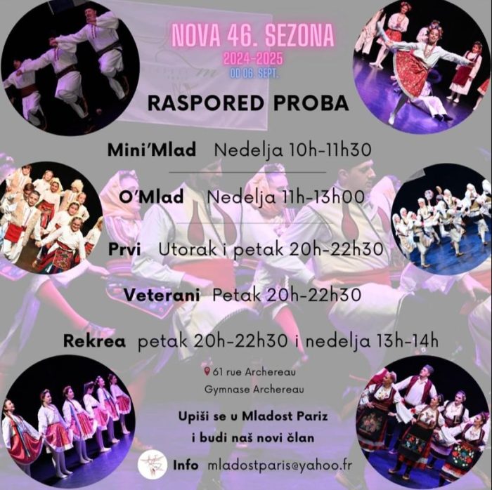 Kulturno-umetničko društvo „Mladost“ iz Pariza sa zadovoljstvom najavljuje početak svoje 46. sezone, koja počinje u petak, 6. septembra. Pozivamo sve zainteresovane da im se pridruže i postanu deo njihove dugogodišnje tradicije.