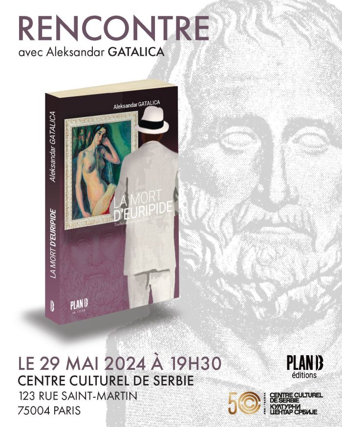 Razgovor s Aleksandrom Gatalicom u Kulturnom centru Srbije moderiraće Žan-Fransoa Galtu, urednik u izdavačkoj kući Plan B, koja je nedavno objavila i francuski prevod knjige „Euripidova smrt”.