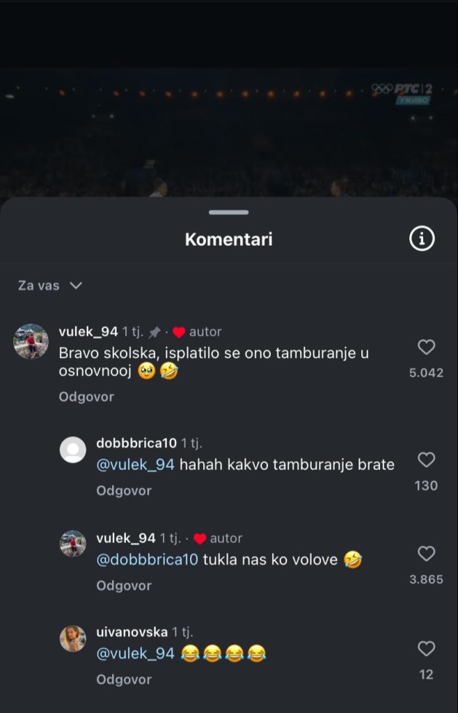 Dok su se svi divili njenom stilu borbe, među školskim drugarima osvanula je i jedna šaljiva razmena komentara. Jedan od njih je napisao: „Bravo, školska, isplatilo se ono tamburanje u osnovnoj“, na šta je neko odgovorio kroz smeh: „Hahaha, kakvo tamburanje brate?“. Brzo je usledio odgovor koji je sve nasmejao: „Tukla nas ko volove!“