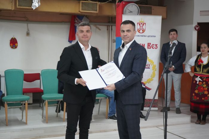 Ministar bez portfelja zadužen za odnose Republike Srbije sa dijasporom, Đorđe Milićević, posetio je Kumanovo i uručio zahvalnicu KUD-u „Srpski vez“ za izuzetan doprinos očuvanju srpske kulturne baštine. Zahvalnicu je primio Dalibor Kitanović, predsednik KUD-a, kao priznanje za kontinuirano čuvanje i promociju srpske kulture u Severnoj Makedoniji.