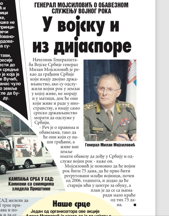 General Milan Mojsilović, načelnik Generalštaba Vojske Srbije, govoreći o uvođenju obaveznog vojnog roka, naglasio je da će svi građani Srbije koji imaju samo srpsko državljanstvo, bez obzira na to gde žive, biti obavezni da služe vojni rok u Srbiji. Ovo uključuje i građane koji žive i rade u inostranstvu. Oni koji imaju dvojno državljanstvo i već su odslužili vojni rok u zemlji prebivališta, biće izuzeti od služenja u Srbiji, prenose novine Vesti.