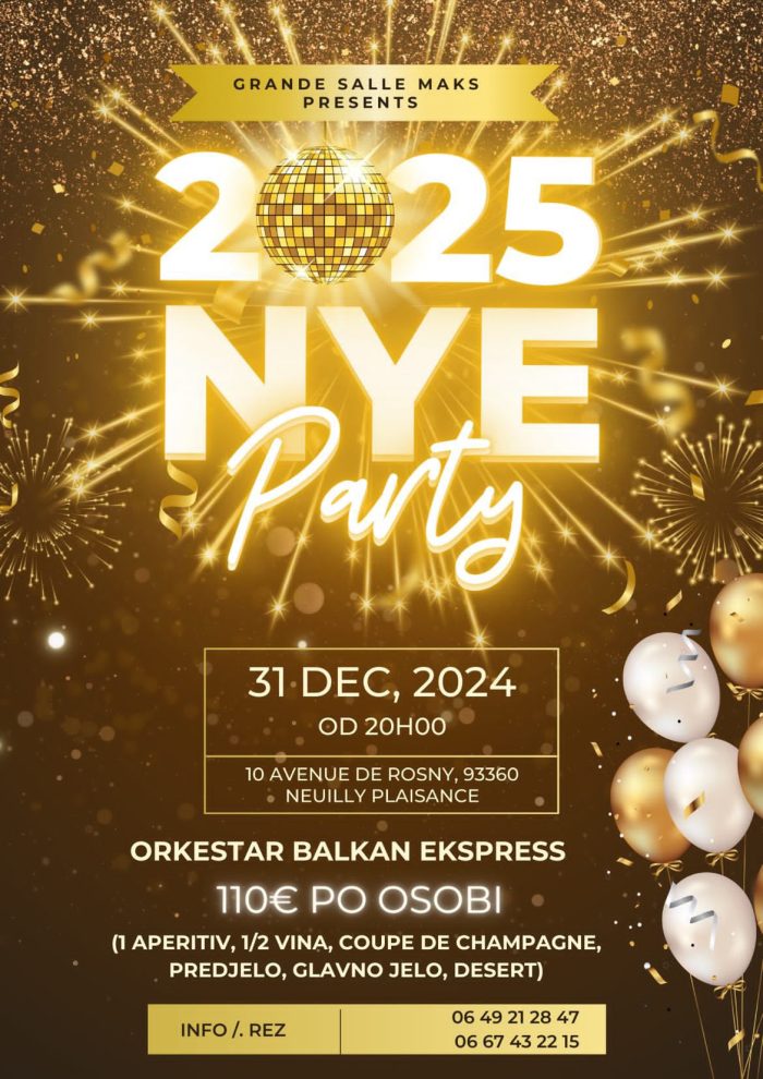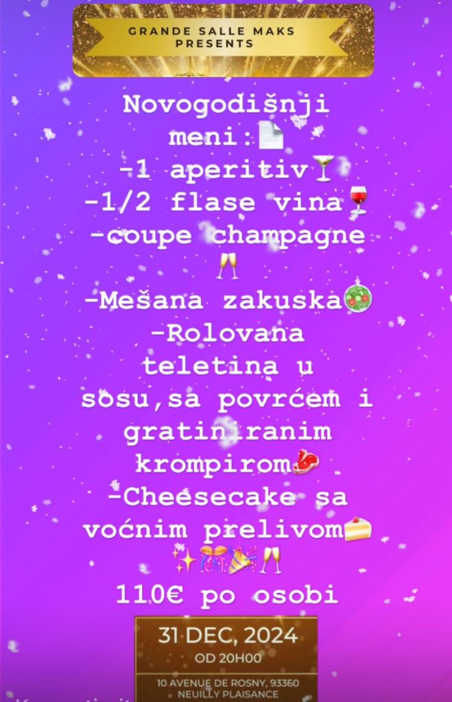 Restoran „Grande Salle Maks“ priprema spektakularan novogodišnji doček koji će vas podsetiti na sve ono što volite kod kuće. Uz našu muziku, naše ljude i nezaboravan ambijent, ulazak u 2025. godinu biće prepun emocija, uživanja i veselja!