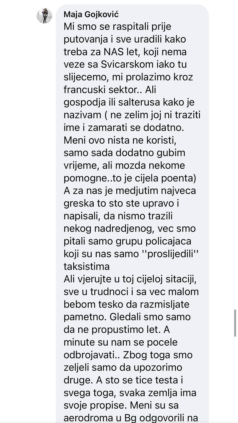 Mi smo se raspitali prije putovanja i sve uradili kako treba za NAS let, koji nema veze sa Svicarskom iako tu slijecemo, mi prolazimo kroz francuski sektor.. Ali gospodja ili salterusa kako je nazivam ( ne zelim joj ni traziti ime i zamarati se dodatno. Meni ovo nista ne koristi, samo sada dodatno gubim vrijeme, ali mozda nekome pomogne..to je cijela poenta) A za nas je medjutim najveca greska to sto ste upravo i napisali, da nismo trazili nekog nadredjenog, vec smo pitali samo grupu policajaca koji su nas samo “proslijedili“ taksistima Ali vjerujte u toj cijeloj sitaciji, sve u trudnoci i sa vec malom bebom tesko da razmisljate pametno.