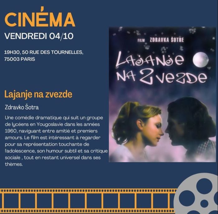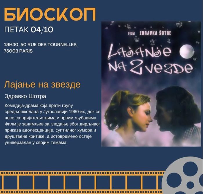 U srcu Pariza, „Federacija mladih Srba Evrope“ priređuje jedinstvenu priliku za sve ljubitelje srpske kinematografije i kulture. Ova organizacija se zalaže za jačanje veza između srpske i francuske zajednice na svim nivoima, uključujući kulturne, društvene i obrazovne aspekte. Takođe, ima za cilj jačanje veza između mladih, kao i pružanje platforme za međusobno povezivanje i razmenu ideja.