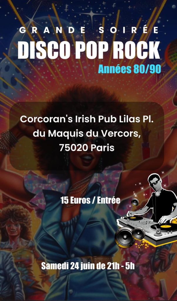 Za sve ljubitelje disco, pop i rock muzike kako ex-yu tako i strane, organizuje se u Parizu sjajna žurka u subotu 24. juna. Ova žurka biće organizovana u pabu Corcoran’s sa početkom od 21h pa sve do 5h. Ulaz 15 evra.