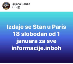 Još jedna današnja objava jednog od naših članova grupe na Facebook-u. Gospođa Ljiljana Cardic je postavila oglas u kome se navodi da se izdaje stan osamnaestom pariskom arondismanu od 01.januara. Gospođu Cardić možete kontaktirati OVDE