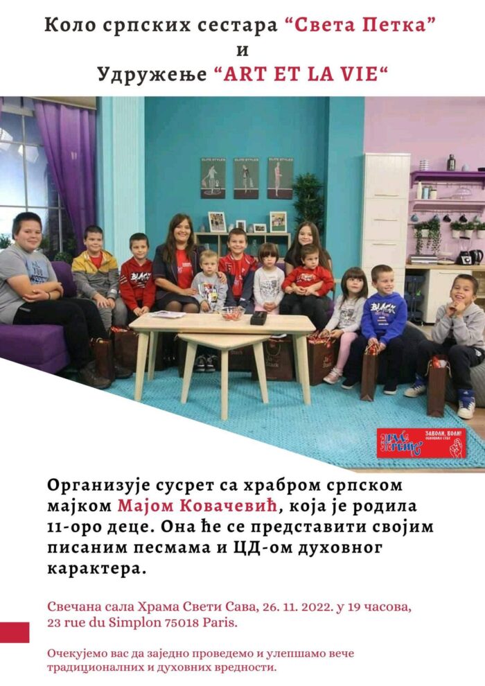 Trenutno su možda najveće patrote porodice koje imaju više od dvoje dece znajući da su srpski narod i Srbija u velikom demografskom problemu. Kada jedna majka rodi 11-oro dece, to je pravi podvig u današnjem vremenu. Ova hrabra srpska majka, Maja Kovačević, će u subotu u svečanoj crkvenoj sali Sveti Sava u Parizu predstaviti svoje pisane pesme i CD duhovnog karaktera.