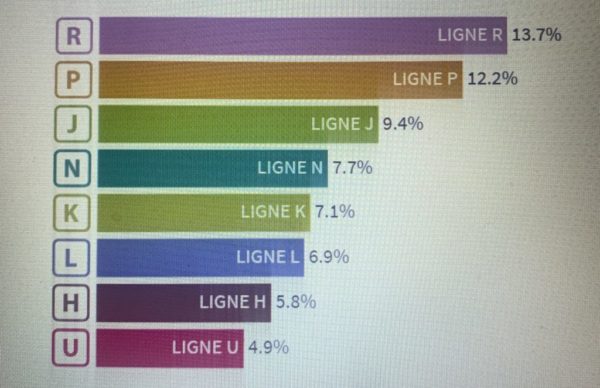 Što se tiče vozova koji voze do najudaljenijih delova pariskog regiona ali i van njega situacija ni tu nije sjajna. Linija R nam donosi najveći procenat zakašnjenja većih od 5 minuta i to 13,7%. Najbolje funkcioniše linija U sa 4,9%.