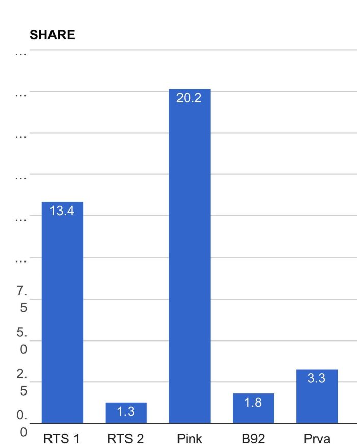 Dok je RTS 1 zauzeo drugo mesto sa gledanošću od 13.4%, razlika od gotovo sedam procenata jasno pokazuje dominaciju Pinka. Prva televizija beleži 3.3%, dok RTS 2 i B92 imaju udel od 1.3% i 1.8%, što ukazuje na značajno manju popularnost.