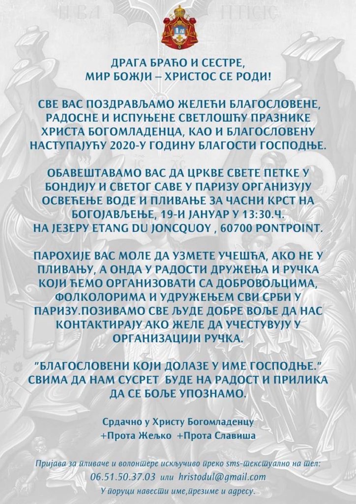 Da sve bude kako treba oko organizacije pobrinula su se dva naša sveštenika Otac Slaviša i Otac Željko bez kojih se ovakav jedan događaj ne bi mogao ni desiti. Plivanje za Časni krst će se održati u nedelju 19.januara 2020.godine sa početkom od 13h30 časova na jezeru Etang du Joncquoy 60700 Pontpoint.