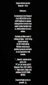 Ako ste putovali ovim letom ili imate bilo kakvu informaciju koja može pomoći, pišite nama, a mi ćemo poruku proslediti osobi koja je objavila oglas. Hitno nam je potrebna pomoć zajednice da se izgubljeni kofer što pre pronađe i vrati vlasnicima. Hvala svima koji će se uključiti.