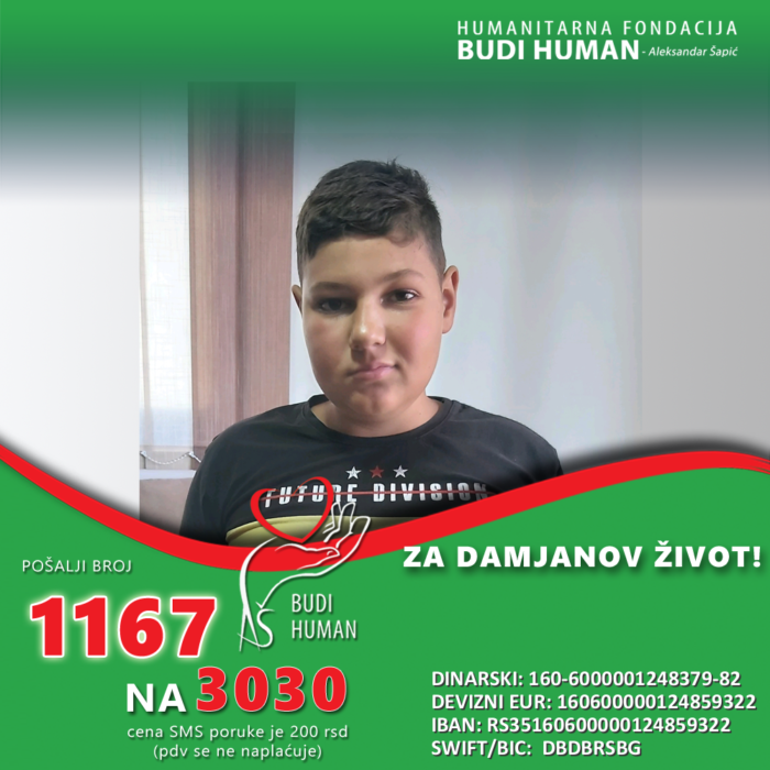 Sredstva su mu potrebna za lečenje, operativne zahvate, specijalističke i kontrolne preglede, za rehabilitaciju, fizikalne tretmane, za laboratorijske analize, lekove, suplemente, medicinski potrošni materijal, za ortopedska pomagala kao i za putne troškove i smeštaj. Pa ovim povodom molimo sve koji su u mogućnosti da doniraju novčana sredstva za Damjana.