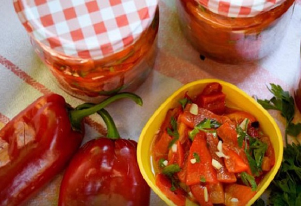 Trempez chaque poivron pelé dans l’huile, retirez immédiatement et disposez dans des bocaux chauds. Ajoutez un peu de sel à chaque rangée de poivrons. Remplissez le pot pour laisser trois doigts vides. Laissez les poivrons dans le pot pendant un autre jour et versez-y du vinaigre de vin. Couvrez simplement le pot avec une assiette car les poivrons bouillent et renversent l’huile.