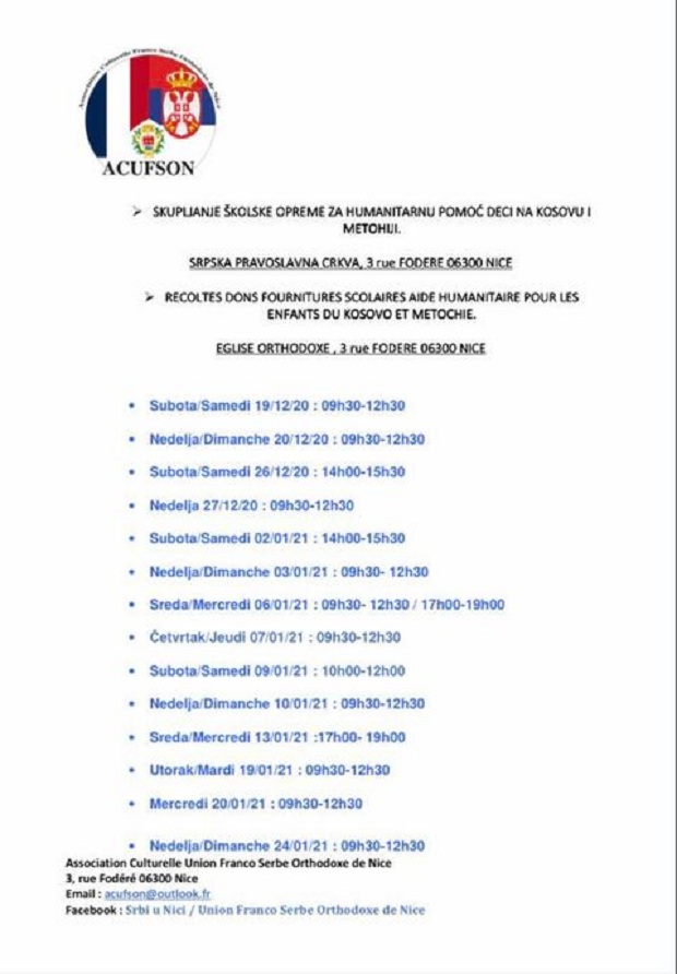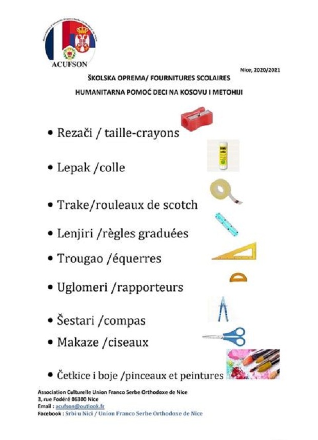 Pravoslavni francusko-srpski savez iz Nice organizuje humanitarnu akciju prikupljanja školskog pribora za decu na Kosovu i Metohiji. Ovu akciju izvode u koordinaciji sa humanitarnom organizacijom Arna Gujona, Solidarnost za Kosovo. Za sada je odziv veoma dobar a ovom prilikom pozivamo sve vas da se priključite akciji.