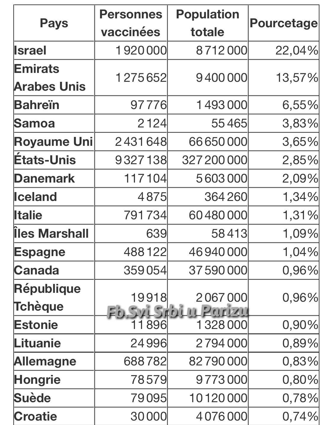 Kao što možete videti na čelu liste su Izraelci gde je već više od petine stanovništva vakcinisano. Što se tiče evropskih zemalja najveći procenat vakcinisanih je u Velikoj Britaniji. Nešto manje od 4% što je miljama daleko od željenih 60%.