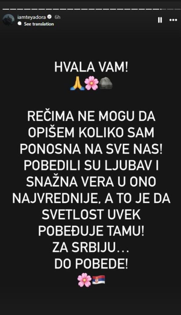 Taj cvet je jako lep simbol, jer se jedna ramonda diže iz pepela i može svakome da znači utehu, nadu, preporod posle ličnih nesreća i stradanja baš kao što je to i za naš narod koji je dosta patio i na kraju uspeo da se izbavi iz toga. Za to su zaslužne naše pradede i ljudi koji su nam pomogli da danas budemo ono što jesmo i da budemo ovde. Ko zna gde mi danas bilo da se nisu žrtvovali za nas – istakla je Teya Dora pre takmičenja.