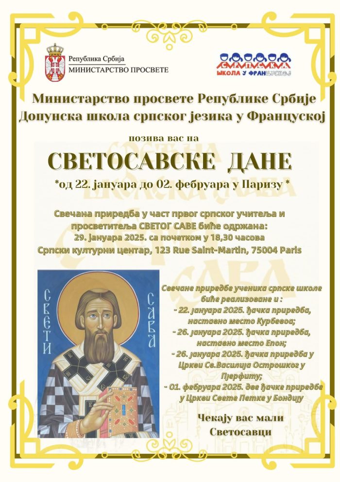 Ministarstvo prosvete Republike Srbije i Srpska dopunska škola u Francuskoj organizuju Svetosavske dane, koji će se održati u Parizu od 22. januara do 2. februara 2025. godine. Ova manifestacija je posvećena Svetom Savi, prvom srpskom učitelju i prosvetitelju.