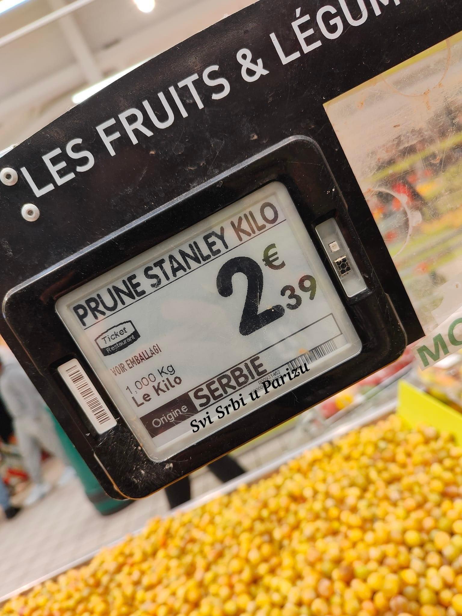 Ovo je jedna prelepa vest, jer se srpska šljiva probija na francusko tržište sa velikim uspehom. Ono što sve malo rastužuje je sama pomisao na srpskog seljaka koji tu šljivu prodaje za niskih 20 dinara. Ona se u Parizu može kupiti za 2,39 evra što je u prevodu 280 dinara, ili četrnaest puta skuplje nego što je proda srpski seljak.