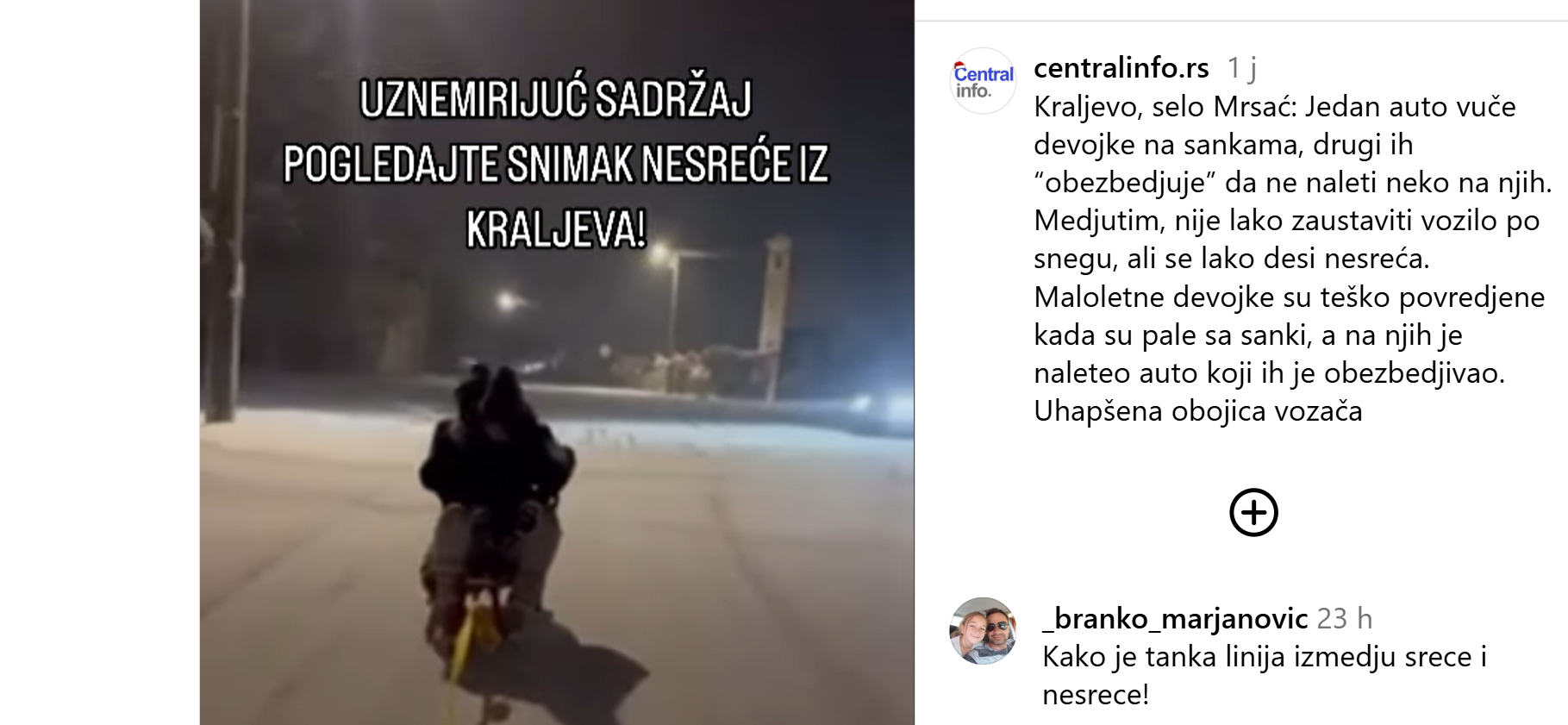 – Nikada ne radite nešto slično. Jedan automobil vuče sanke, dok drugi ide iza da „obezbeđuje“. Na snegu je izuzetno teško zaustaviti vozilo, a tragedija se desi u sekundi. Maloletne devojke su teško povređene nakon pada, a zatim ih je udarilo vozilo koje je išlo iza njih. Obojica vozača su uhapšena – naveo je Mijatović.