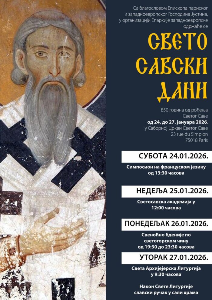 Povodom obeležavanja 850 godina od rođenja Svetog Save, u Crkva Svetog Saveu u Parizu biće održani Svetosavski dani, višednevni duhovno-kulturni program namenjen srpskoj dijaspori u Francuskoj, ali i francuskoj javnosti.
