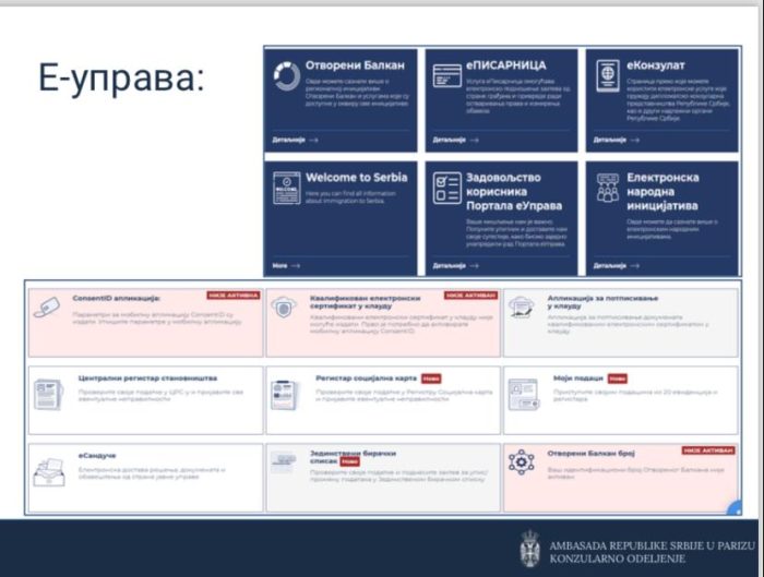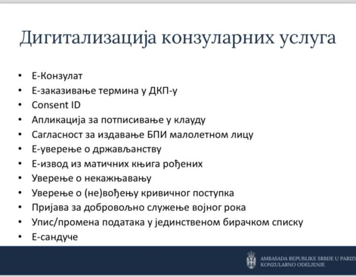 Ambasada Republike Srbije u Francuskoj predstavila je plan za digitalizaciju konzularnih usluga sa ciljem da unapredi administrativne procese i olakša pristup srpskim državljanima u Francuskoj. Program obuhvata E-upravu, E-konzulat, i E-vize, koji će omogućiti bržu i efikasniju uslugu.