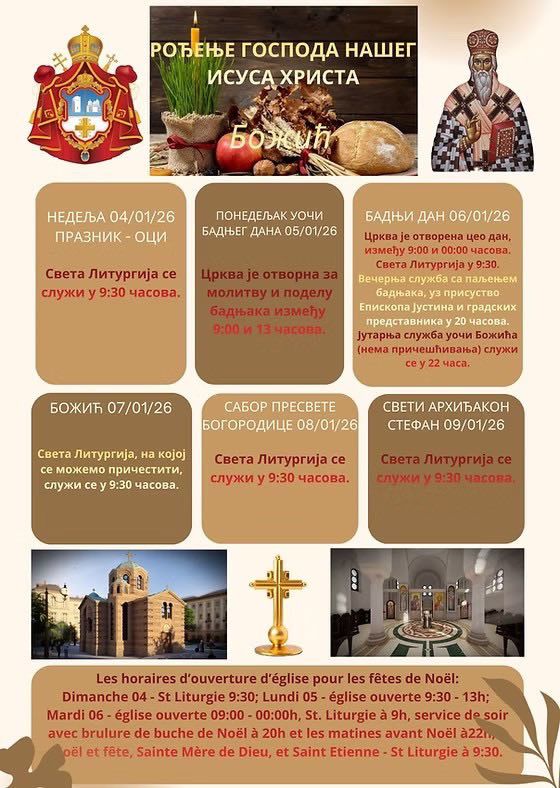 Objavljen je raspored bogosluženja povodom božićnih praznika u Crkvi Svetog Vasilija Ostroškog, koja se nalazi na periferiji Pariza. Poseban značaj ove godine ima centralna božićna služba uoči praznika, uz prisustvo Episkopa Justina, što predstavlja jedan od najvažnijih liturgijskih trenutaka božićnog praznovanja za vernike u Parizu i okolini.