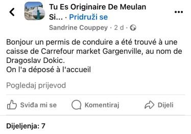 „Zdravo, na kasi Carrefour marketa Gargenville pronađena je vozačka dozvola na ime Dragoslav Dokić.