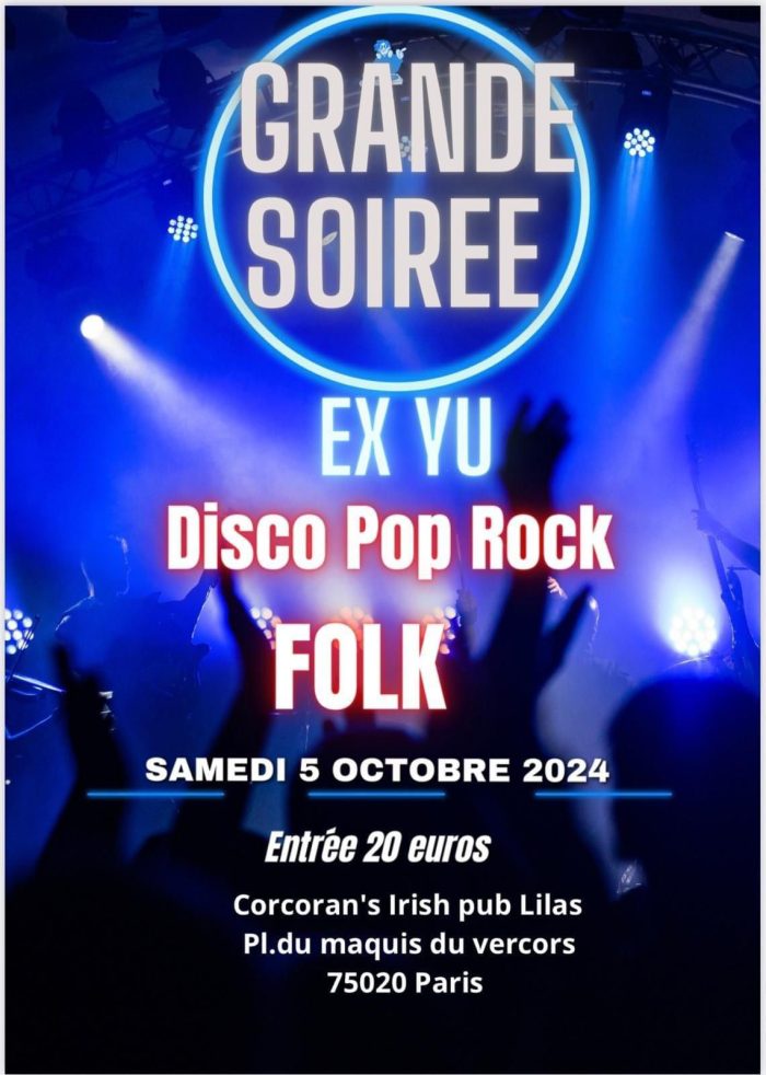 Dragi prijatelji, pozivamo vas na spektakularno veče ex-YU muzike u srcu Pariza! U subotu, 5. oktobra, u omiljenom mestu okupljanja naših ljudi, „Corcoran’s Irish pub Lilas“, na adresi Pl. du Maquis du Vercors, 75020 Paris, organizuje se nezaboravnu „Grande Soirée“ posvećeno najboljoj disco, pop, rock i folk muzici sa prostora bivše Jugoslavije.