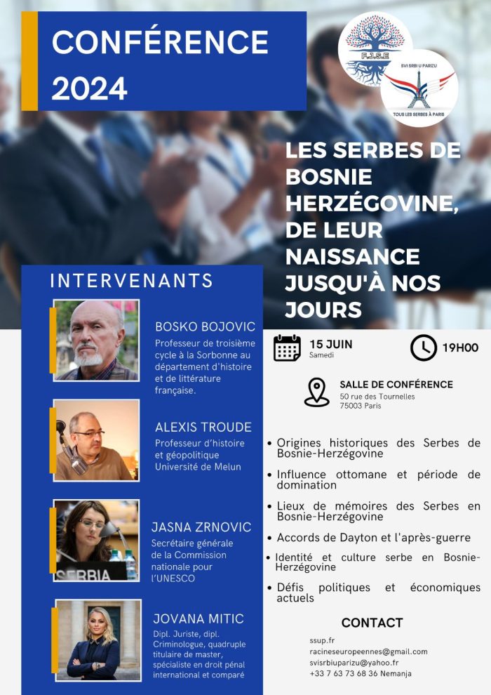 Dva ugledna udruženja „Svi Srbi u Parizu“ i „Federacija mladih Srba Evrope“ sa zadovoljstvom vas pozivaju na konferenciju pod nazivom „Srbi u Bosni i Hercegovini – od postojanja do današnjeg dana“. Ovaj značajan događaj u organizaciji ova dva udruženja održaće se u subotu, 15. juna u 19h, u Konferencijskoj sali na adresi 50 rue des Tournelles. Konferencija će biti na francuskom jeziku.