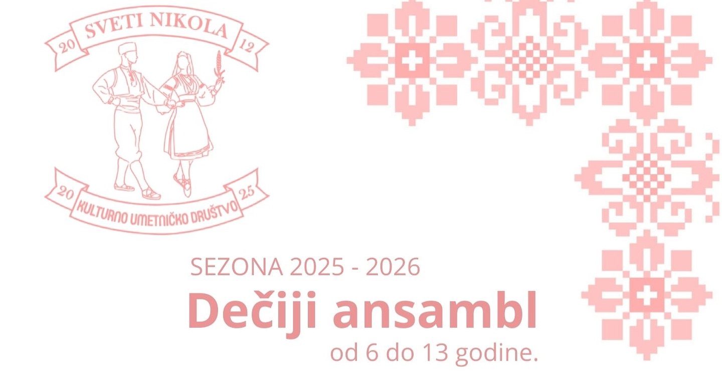 Kulturno umetničko društvo „Sveti Nikola“ objavljuje upis u Dečiji ansambl za sezonu 2025–2026. Ansambl je namenjen deci uzrasta od 6 do 13 godina i predstavlja priliku za kvalitetno druženje, razvijanje timskog duha i negovanje kulturnog nasleđa. Kroz igru i pesmu, najmlađi uče o tradiciji, razvijaju osećaj pripadnosti i pozitivno koriste slobodno vreme.